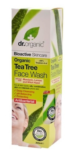 Dr Organic Face Wash Tea Tree 200ml er en mild ansigtssæbe, der renser effektivt uden at udtørre huden. Denne sæbe indeholder økologisk tea tree olie, kendt for sine antibakterielle egenskaber. Perfekt til uren hud og daglig brug.